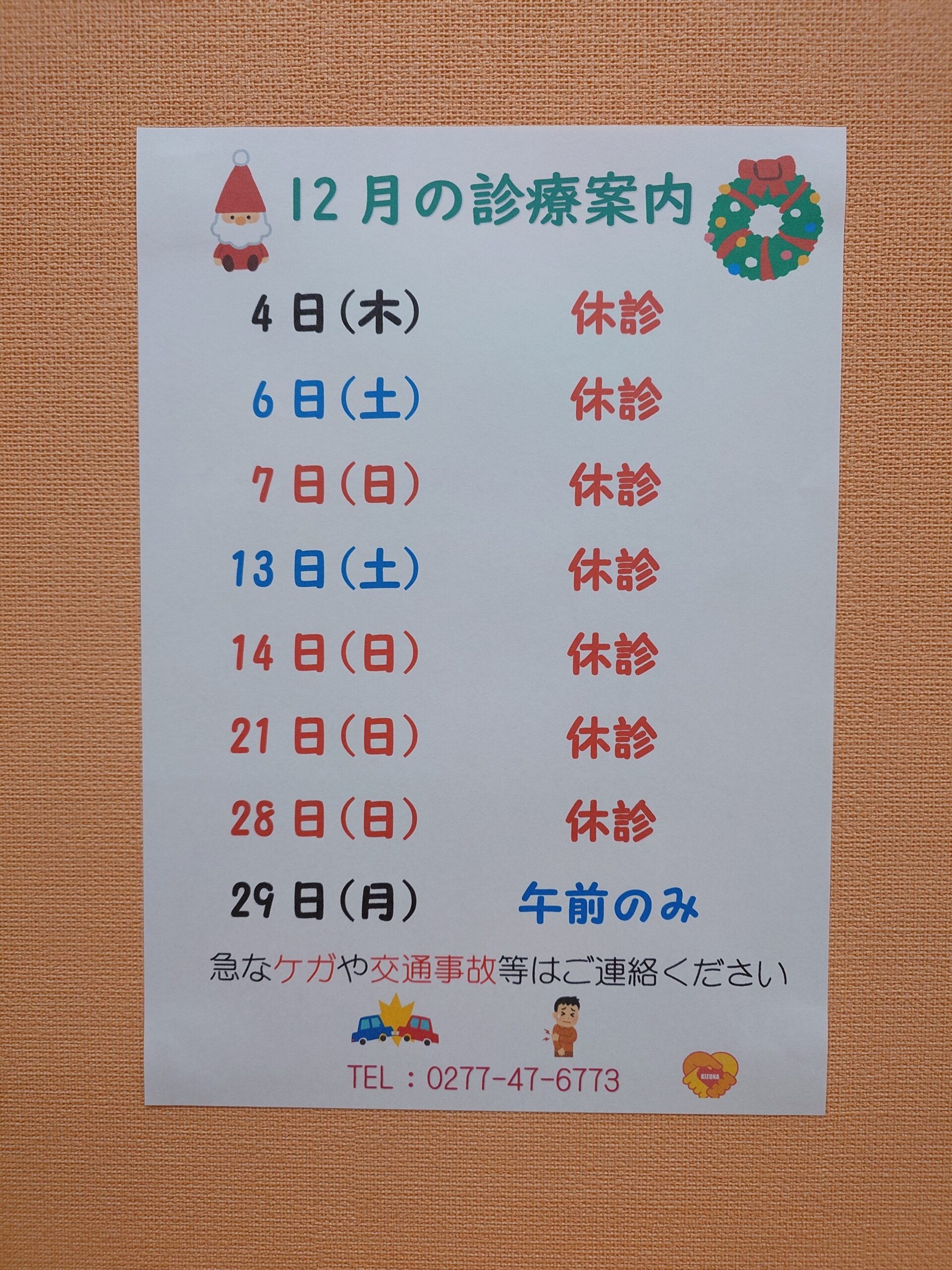 12月の診療案内です。4日(木)、6日(土)、13日(土)は休診となります。診療時間以外の時間でも交通事故患者様、急なケガなどは受付可能ですので、万が一交通事故に遭われてしまった場合にはきずな接骨院にご連絡下さい。祝日の初診の患者様は交通事故、急なケガの方に限らせていただきます。