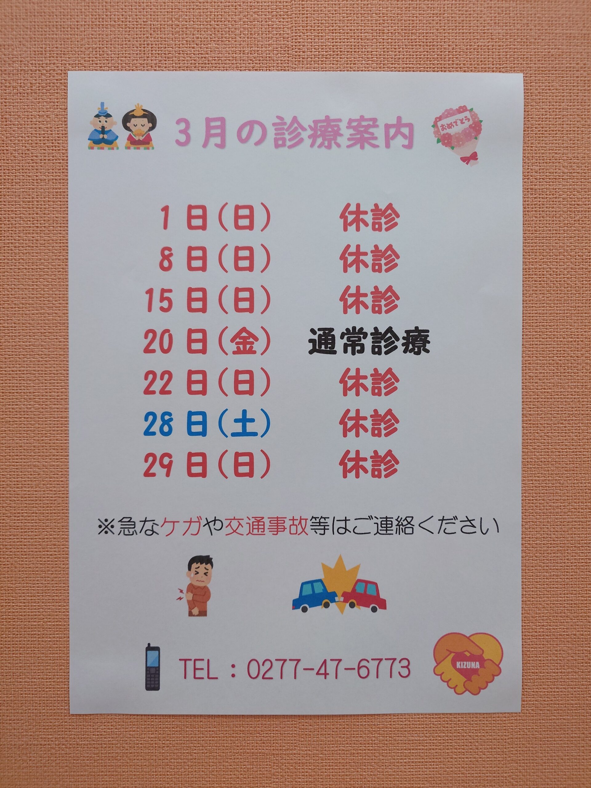 3月の診療案内です。20日(金)は通常診療となります。28日(土)は休診となります。祝日の初診の患者様は交通事故、急患の方のみとさせていただきます。