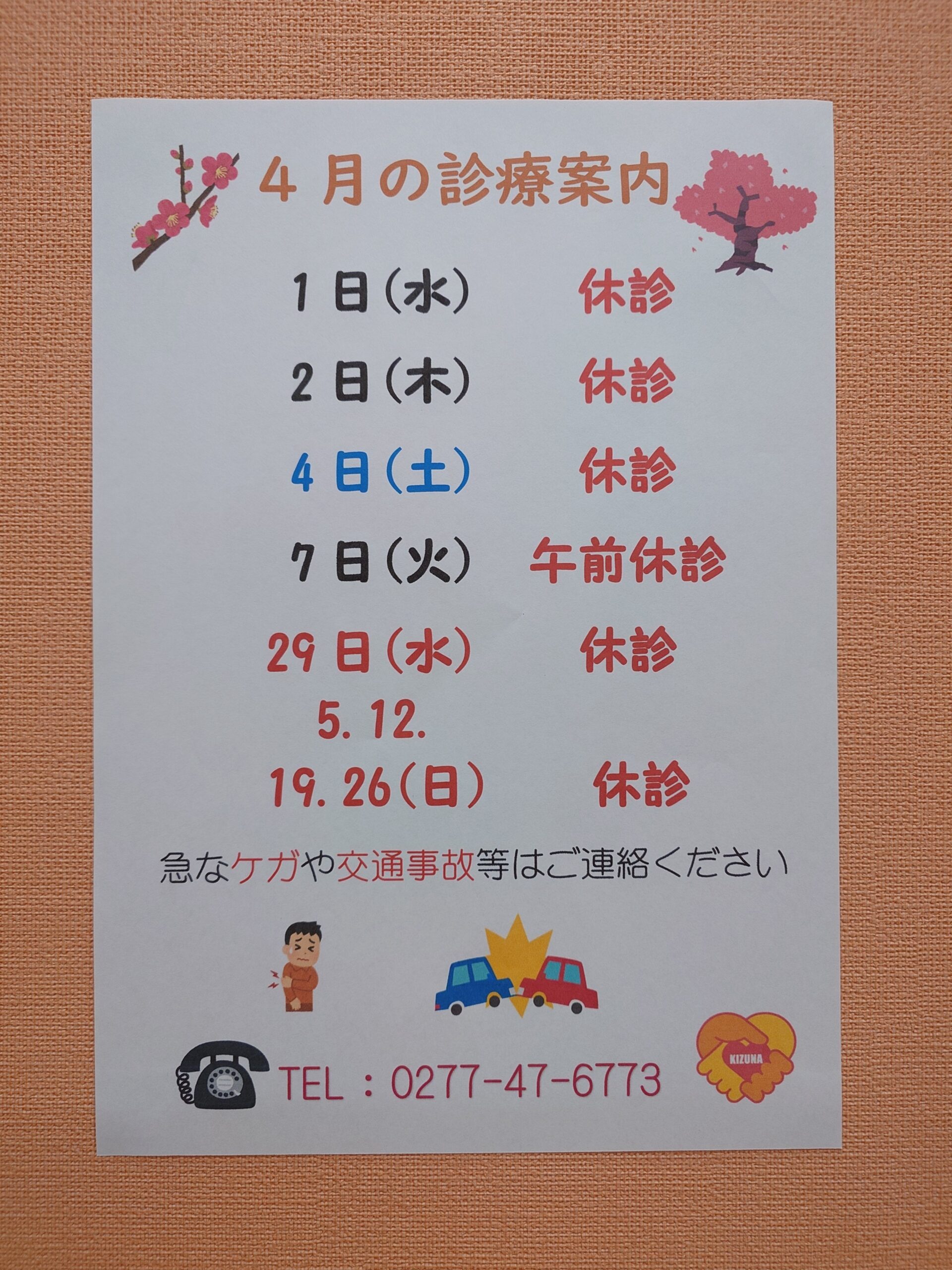 4月の診療案内です。1日(水)、2日(木)、4日(土)、29日(水)は休診となります。28日(土)は休診となります。祝日や休みの日の初診の患者様は交通事故、急患の方のみとさせていただきます。